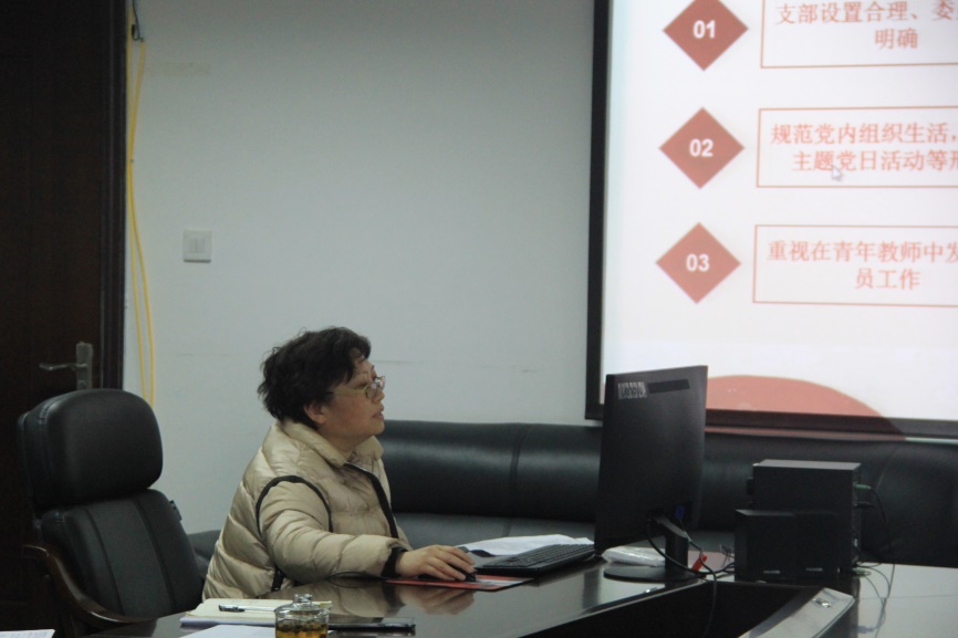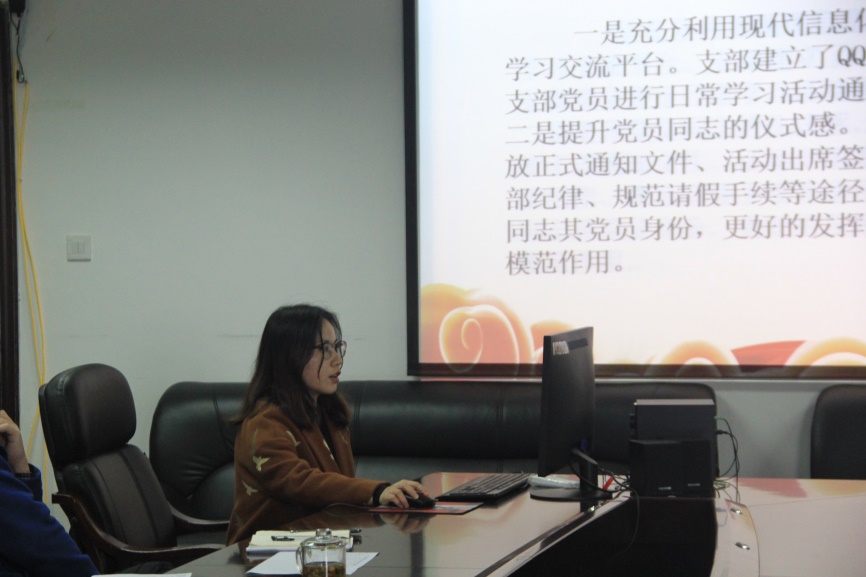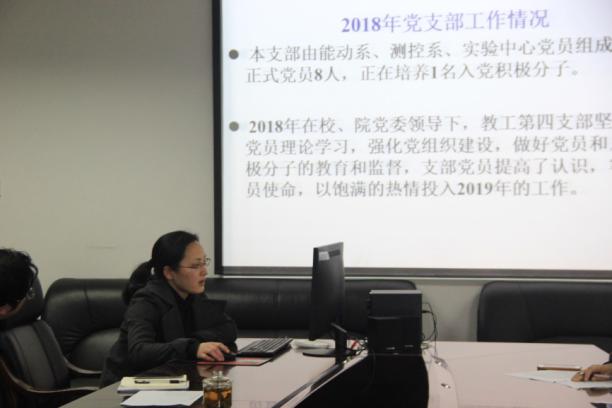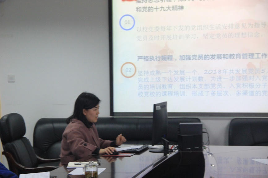 紧接着,教工支部第一、二、三、四支部书记邹晓松、何志琴、刘艳、赵正红等同志进行了述职。对各自支部过去一年开展的党建工作及成果进行了汇报,并对存在的问题及今后发展方向进行了相关讲解。教工支部第一支部书记邹晓松表示,每一位党建工作者,除了加强自身学习外,还应在今后的党建工作中实事求是,不忘初心,牢记使命。教工第二支部书记何志琴同志说到,支部成员投入精力有限,工作落实力度有待加强,工作方式有待创新。希望在新一年的党建工作中,着力解决这些问题。教工第三党支部书记刘艳同志表示,自己要加强相关方面的学习,提高党务工作能力和个人自身素养,集思广益,提高下一年的党建工作水平。教工第四支部书记赵正红说到:在新的一年中要加强创新党支部活动。