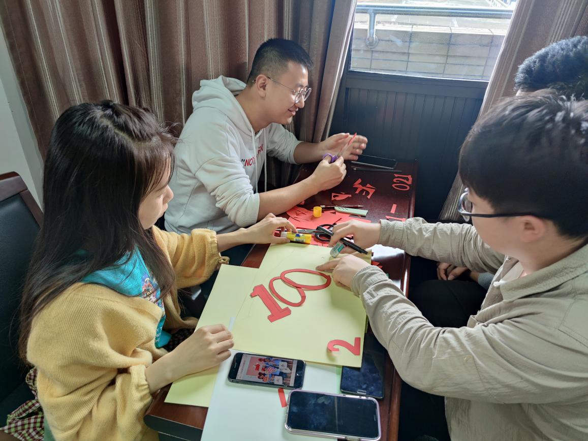 活动伊始,研究生党总支书记郭翠翠老师向参加活动的党员同志们介绍了此次活动的目的和意义,并提到党员们在学习红色精神、传承红色基因、勇担时代责任的同时,要加强党员之间的互动交流合作,形成合力,树立集体意识。接着,郭老师以及工作人员为大家分发绘画材料工具,活动以小组形式开展,每个小组由三到五个人自由组合,党员同志们以红色历史故事为背景,自由发挥,进行手绘创作。活动进行过程中党员同志们热情高涨,大家集思广益,有的在用彩笔进行色彩填充,有的在展示自己笔酣墨饱的书法,有的则在手工制作五角星。党员同志们的每一笔红色都表达了对党和国家的拳拳赤子之心,都印记着对党的红色祝福。绘画完成后,大家纷纷展示了自己的绘制作品,有北京天安门、有中国地图、有党旗飘飘,也有“岁月逢春花遍地,人民有党志登天”这样的佳句,虽风格不一,图案色彩也各有特点,但都体现了对国家、对党的美好祝福。最后大家互相交流收获心得,并一起合照留念。