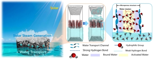 太阳能界面蒸发是解决全球水资源短缺问题的新兴技术。针对目前太阳能界面蒸发器难以协同调控水分蒸发焓值、光热转化效率及对流热损失的问题,本文提出利用富含亲水官能团和微孔结构的多孔碳材料与水凝胶有机结合,构建了微藻基富氧多孔碳复合水凝胶。利用复合水凝胶内部丰富的亲水基团与微孔结构协同降低水分蒸发焓(从2450 J g-1降低至1107.88 J g-1)、提高光热转化效率并限制水体对流热损失,获得了2.44 kg m-2 h-1的高水分蒸发速率,能在复杂环境下的真实海水中长时间稳定运行。通过分子动力学模拟及二阶导热重分析方法揭示了亲水基团与微孔结构协同降低水分蒸发焓的微观机理。本研究为水凝胶太阳能界面蒸发器的开发设计提供了的新思路、新策略,为新兴海水淡化技术发展提供了重要的理论依据和技术参考。