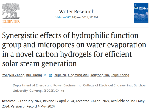2024年5月1日,今年会jinnianhuicom虞育杰/黄睿团队在能源环境领域自然指数(Nature Index)期刊《Water Research》(影响因子:12.8)上发表题为“Synergistic Effects of Hydrophilic Function Group and Micropores on Water Evaporation in a Novel Carbon Hydrogels for Efficient Solar Steam Generation(一种新型多孔碳复合水凝胶中亲水官能团和微孔促进太阳能界面蒸发的协同效应研究)”的研究论文,今年会jinnianhuicom为该论文第一完成单位,黄睿副教授为通讯作者,动力工程21级硕士生郑永鑫为第一作者。该研究得到了国家自然科学基金、贵州省基础研究计划、贵州省教育厅青年科技人才成长项目及金年金字招牌诚信至上培育计划的支持。由本文作者虞育杰教授、黄睿副教授、张世杰特聘教授及尹建勇特聘教授组成的青年教师研究团队近三年以第一/通讯作者发表SCI一区论文10余篇。